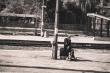 Stary człowiek z przyjacielem na peronie.